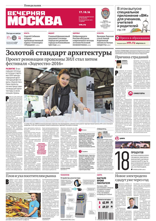 «Вечерняя Москва» — ежедневная российская вечерняя газета, старейшее из вечерних изданий в России, учрежденное в 1923 году. Выходит пять дней в неделю, кроме субботы и воскресенья. Отличается тем, что рассказывает о событиях еще не завершившегося дня. Оперативно освещает хронику и особенности жизни Москвы, охватывает все слои общества и большинство профессиональных и возрастных групп читателей.Издание представлено тремя выпусками – утренним ежедневным, вечерним (выходит три раза в неделю), еженедельным (выходит по четвергам).