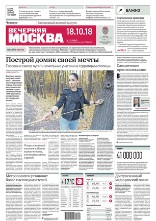 «Вечерняя Москва» — ежедневная российская вечерняя газета, старейшее из вечерних изданий в России, учрежденное в 1923 году. Выходит пять дней в неделю, кроме субботы и воскресенья. Отличается тем, что рассказывает о событиях еще не завершившегося дня. Оперативно освещает хронику и особенности жизни Москвы, охватывает все слои общества и большинство профессиональных и возрастных групп читателей.Издание представлено тремя выпусками – утренним ежедневным, вечерним (выходит три раза в неделю), еженедельным (выходит по четвергам).