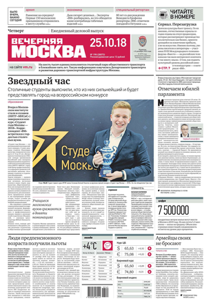 «Вечерняя Москва» — ежедневная российская вечерняя газета, старейшее из вечерних изданий в России, учрежденное в 1923 году. Выходит пять дней в неделю, кроме субботы и воскресенья. Отличается тем, что рассказывает о событиях еще не завершившегося дня. Оперативно освещает хронику и особенности жизни Москвы, охватывает все слои общества и большинство профессиональных и возрастных групп читателей.Издание представлено тремя выпусками – утренним ежедневным, вечерним (выходит три раза в неделю), еженедельным (выходит по четвергам).