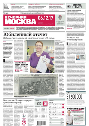«Вечерняя Москва» — ежедневная российская вечерняя газета, старейшее из вечерних изданий в России, учрежденное в 1923 году. Выходит пять дней в неделю, кроме субботы и воскресенья. Отличается тем, что рассказывает о событиях еще не завершившегося дня. Оперативно освещает хронику и особенности жизни Москвы, охватывает все слои общества и большинство профессиональных и возрастных групп читателей.Издание представлено тремя выпусками – утренним ежедневным, вечерним (выходит три раза в неделю), еженедельным (выходит по четвергам).