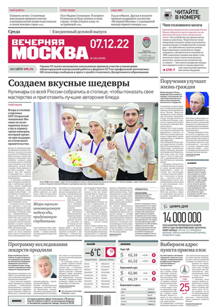 «Вечерняя Москва» — ежедневная российская вечерняя газета, старейшее из вечерних изданий в России, учрежденное в 1923 году. Выходит пять дней в неделю, кроме субботы и воскресенья. Отличается тем, что рассказывает о событиях еще не завершившегося дня. Оперативно освещает хронику и особенности жизни Москвы, охватывает все слои общества и большинство профессиональных и возрастных групп читателей.Издание представлено тремя выпусками – утренним ежедневным, вечерним (выходит три раза в неделю), еженедельным (выходит по четвергам).